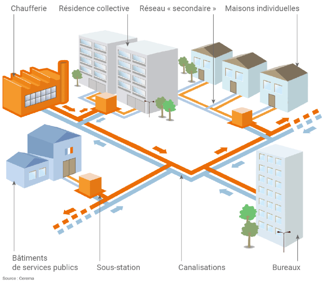 Un réseau de chaleur exploite et distribue le chauffage urbain, principalement généré à partir de sources d’énergies renouvelables telles que la géothermie, le bois, la biomasse, l’incinération des déchets ou l’énergie solaire. Cette infrastructure permet aux copropriétés connectées de bénéficier d’un chauffage plus économique, sécurisé et respectueux de l’environnement.